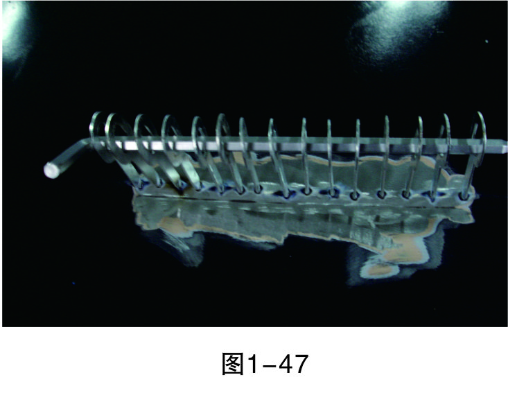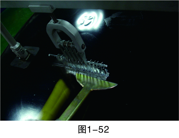 步驟6(穿進L形鐵):在介子中穿入L形鐵,以便整形架的拉鉤能固定在上面進行拉伸作業(yè),如圖1-47所示。