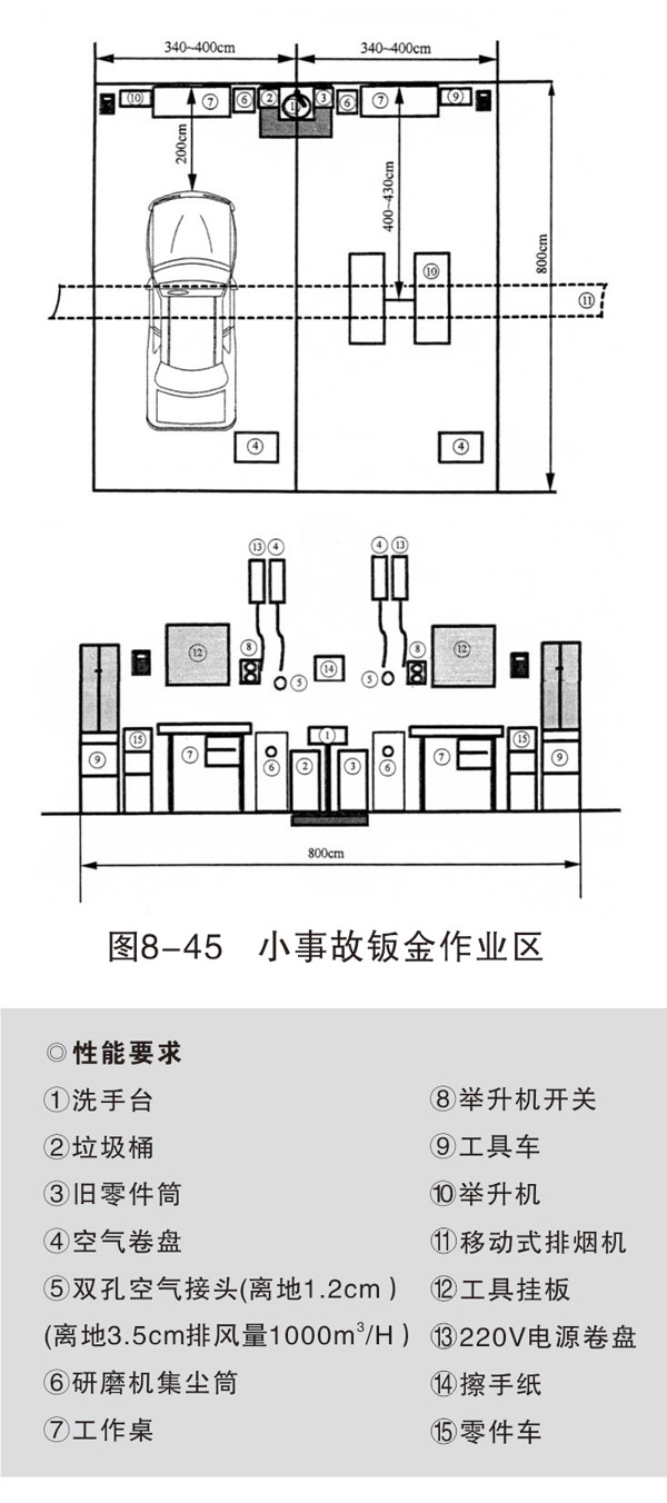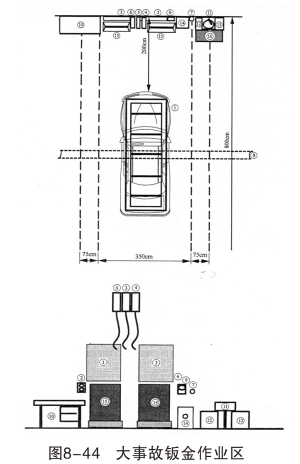 損傷修復和焊接作業(yè)區(qū)域可各設置 4~6個工位,每個工位的面積約400cm×800cm,每個工位配相應的設備和操作臺(架)。車身校正作業(yè)一般設一個工位,面積500cm×800cm。如條件允許,可以根據不同類型的校正架,設置2~3個工位。